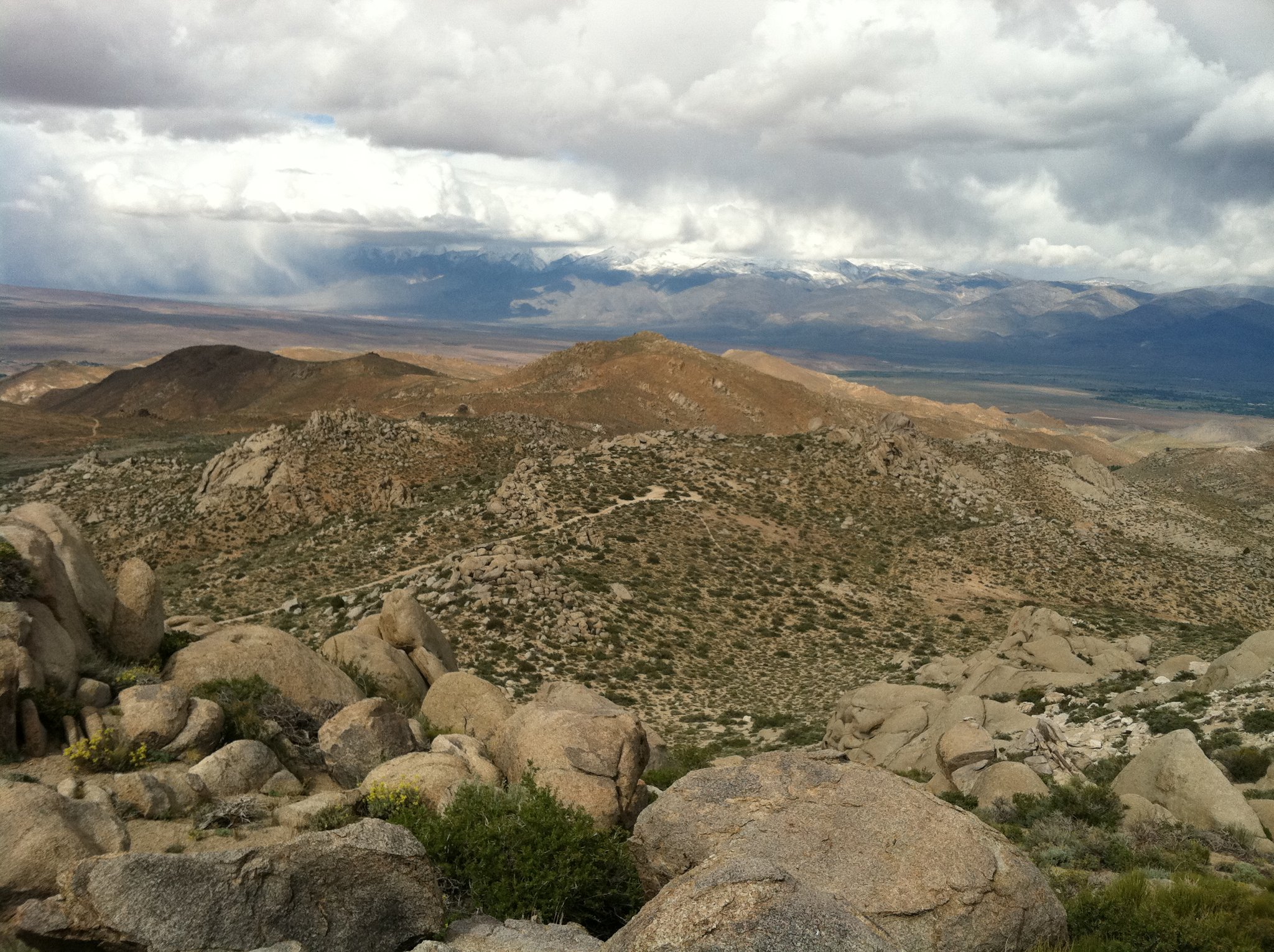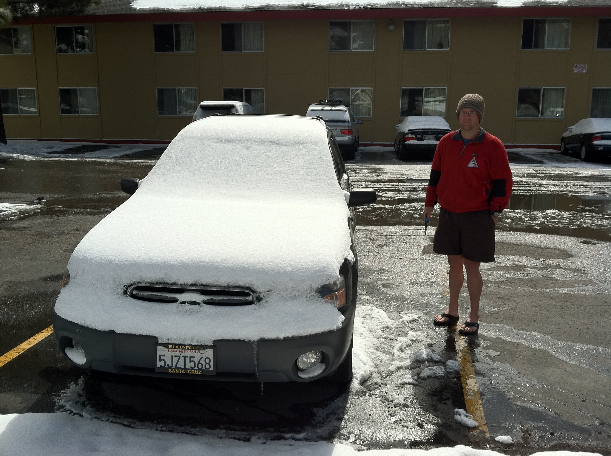 Mike and I both love the Eastern Sierras and the area around Bishop – it’s just a long way to go for a weekend trip (a 6hr drive if Tioga Pass is open, longer if you have to go via Sonora Pass or Carson/Monitor Pass). So the Memorial Day long weekend at the end of May seemed like a perfect opportunity to head out that way, and being 2.5 weeks before the start of Race Across the West it seemed like good timing – do some shorter rides but still get a good workout in, and get some elevation acclimatization. At this point I’d given up on getting any heat training since spring and summer seem to have bypassed California. Of course that didn’t mean that I was expecting snow storms and sub-freezing temps (which is what we got)!!