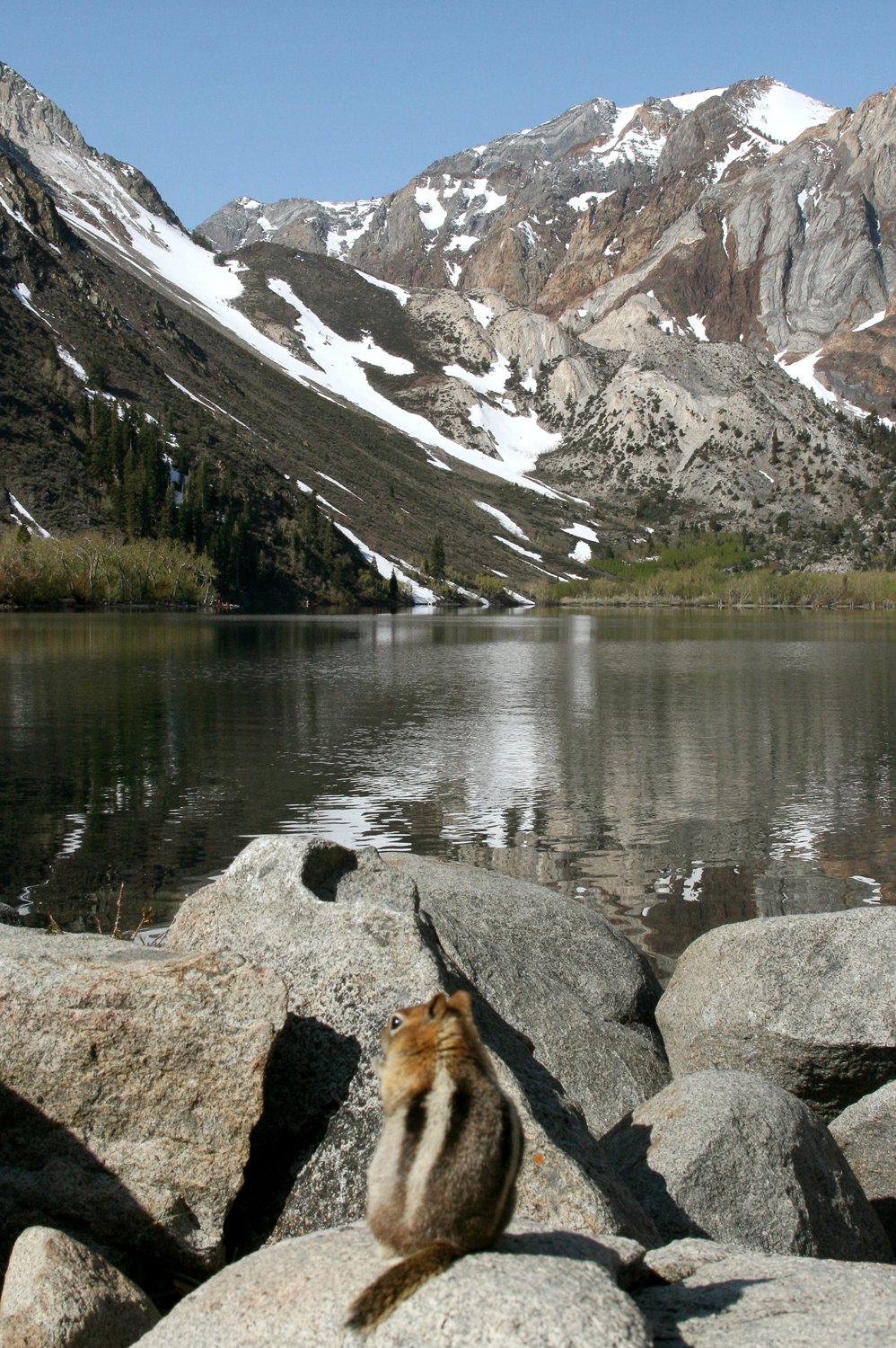 Sunday morning we got up and visited Schat’s Bakery in Mammoth before heading south towards Independence where we were going to do the Onion Valley Road climb – the hardest climb in California according to the book Mike had. First though we stopped off at Convict Lake just south of Mammoth to eat our pastries from the bakery and soak in the great views. There was a squirrel there that was also enjoying the view – of our pastries!!! He was a brave little fella, and even darted onto my foot. Mike was mean and put out his hand pretending he had food in (when he didn’t), so the little guy bit his finger!! Serves him right!
