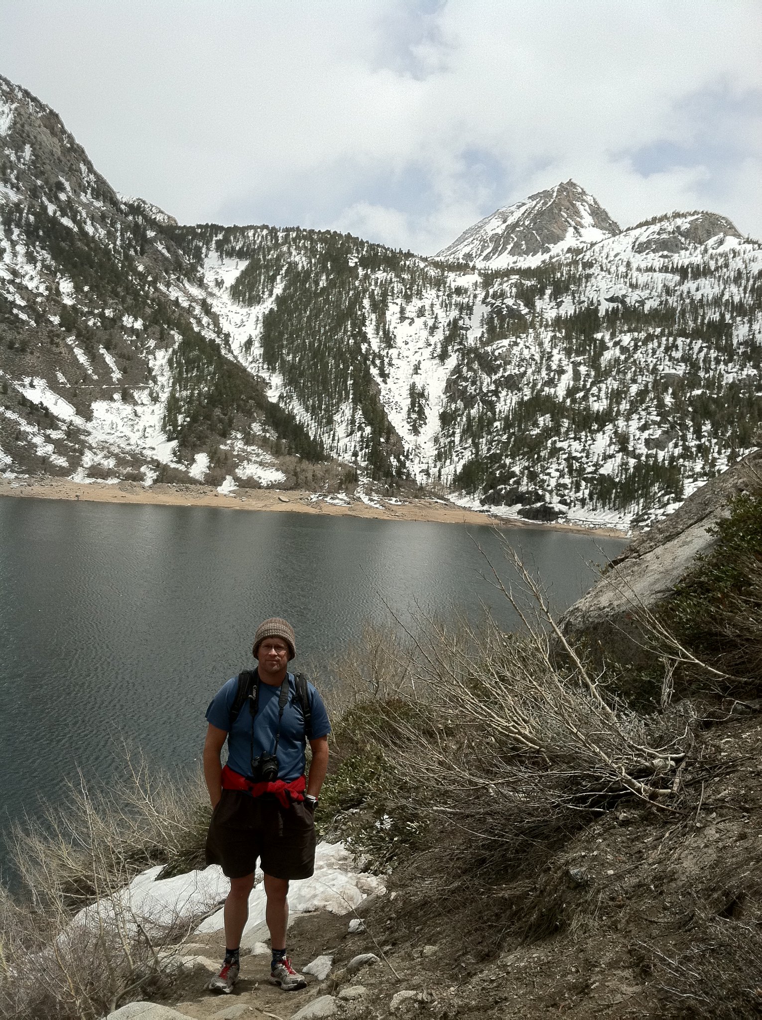 We drove up towards South Lake and again entered a snow storm, and the temps quickly dropped below freezing again…. At South Lake we couldn’t really see anything – it was completely socked in. So then we headed to Lake Sabrina. It was a bit clearer there, so we decided to explore a little bit and hike around the lake. We made it to the end of the lake, but then couldn’t find a way to cross the inlet creek, plus we weren’t sure if the trail was passable on the other side of the lake since there was more snow on that side, and it was on the side of a mountain. So we back tracked the way we came. During our hike the clouds came and went and came again, so one moment we could see the mountains, and the next we couldn’t! The wind picked up on our return, and it started snowing a bit again. It was still a nice 3+ mile hike at about 9,000ft elevation though with some nice views of the lake and the surrounding mountains.