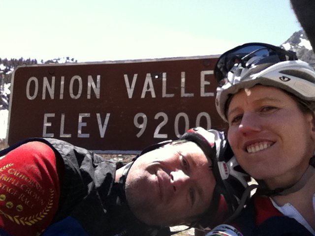 From Convict Lake we headed south to Independence. It was much clearer than the previous day, so we could see the mountain ranges on each side of the valley. The climb up Onion Valley Road is 13 miles long and climbs 5,200ft (going from about 4,000ft in Independence up to 9,200ft at the top), and the last 10 miles are a steady gradient above 8% – yowzers! The bottom 4-5 miles of the climb are deceptive – it doesn’t even look like you’re climbing much since it’s a sloped valley floor that’s so common in the desert as it leads to the base of the mountains, but we could tell from our exertion level that we were definitely climbing!!