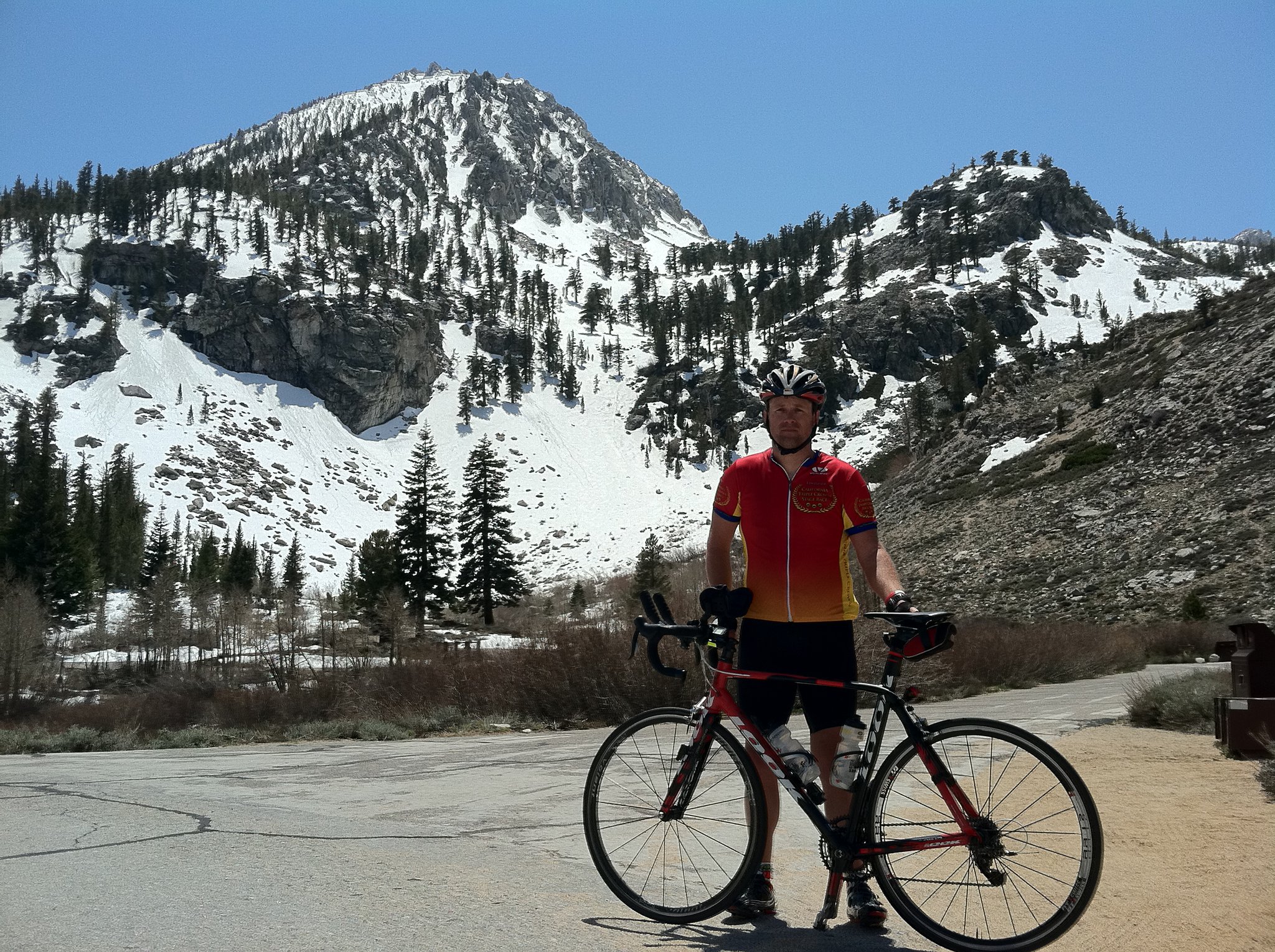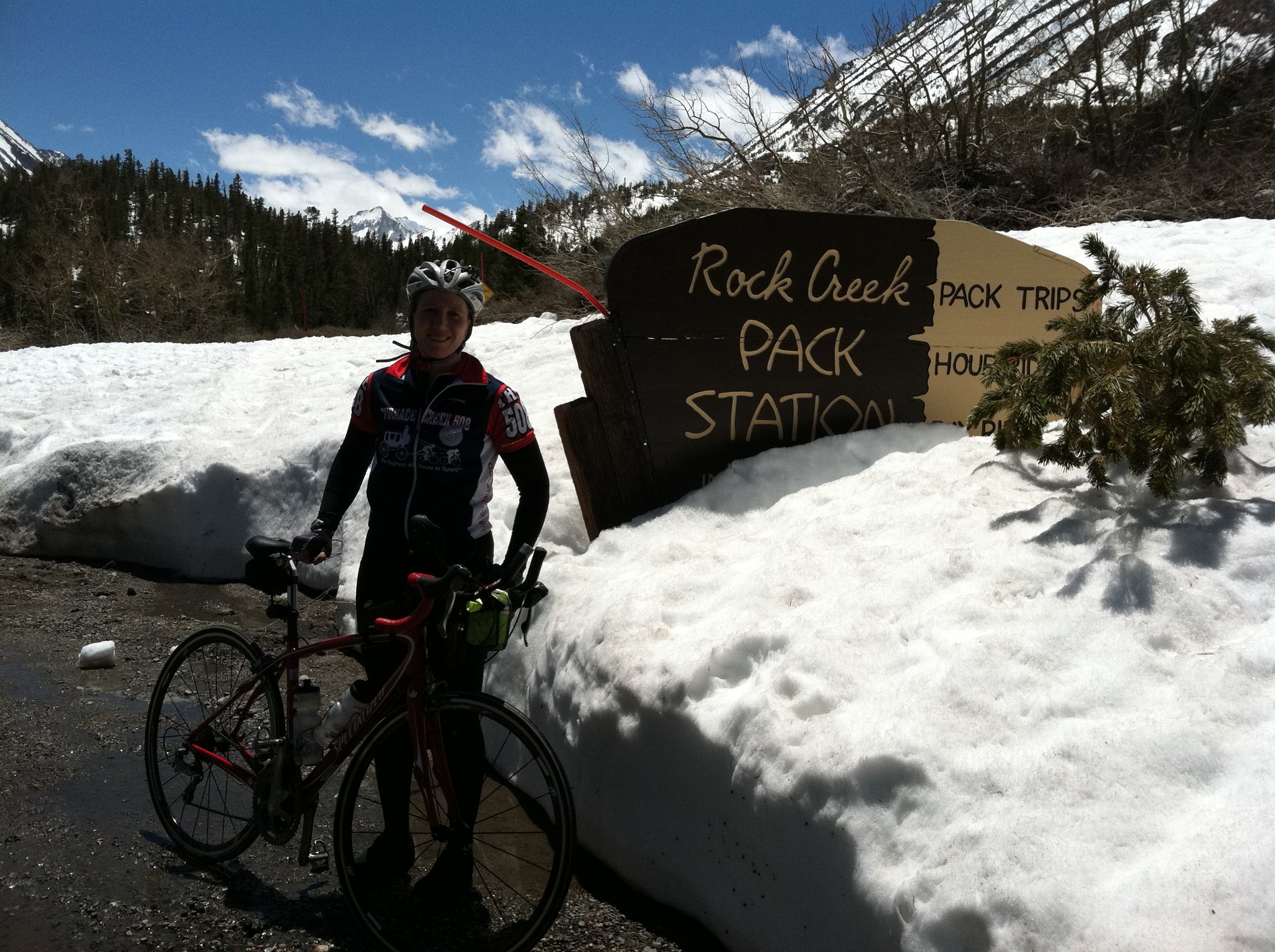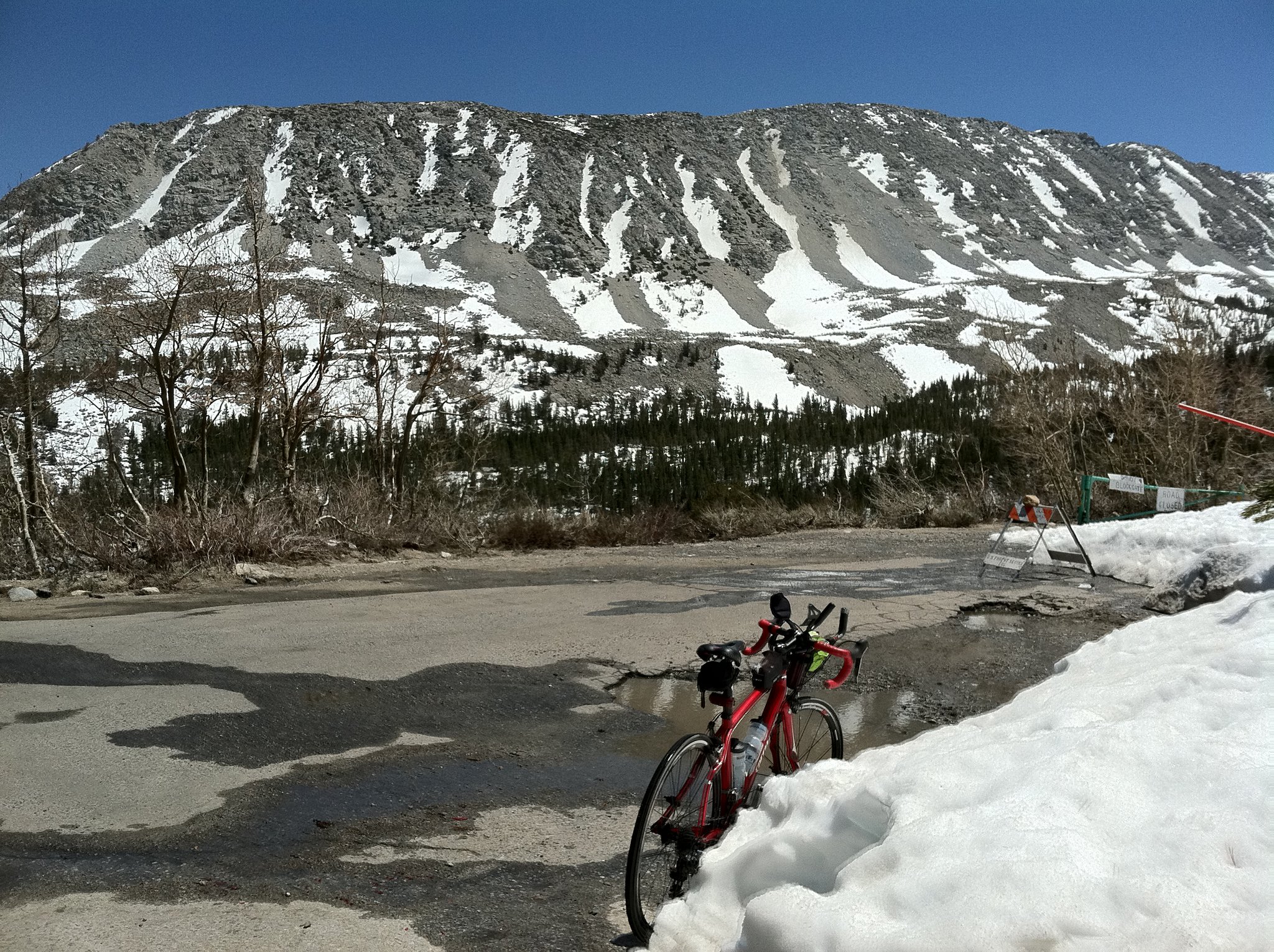I finally got to the top, and there was lots of snow around, and the lake near the end of the road was covered in ice. It was however a beautiful view up the valley into the mountains. The end of the road was marked by a large wall of snow. I propped my bike up against the snow and took some pictures. The ranger came by and offered to take my picture, so I graciously accepted his offer, and we chatted for a bit. It looked like this was the end of the paved road, which was supposedly at 10,300ft, but now I’m not so sure since someone else who did the ride that weekend posted that it was only 9,900ft at that point. Regardless of whether it was 10,300ft or 9,900ft, it was still pretty darned high! It had taken me about 2.5hrs to climb the 9 miles – certainly not very fast, but given the conditions and the fact that I wasn’t trying to kill myself off with super hard efforts this close to RAW I wasn’t too upset.